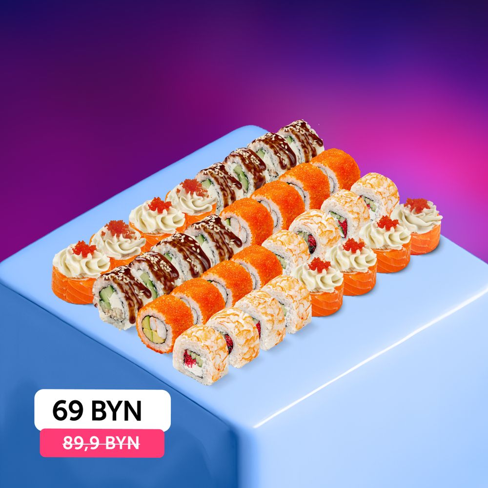 Побалуй себя набором роллов с лососем, морепродуктами и икрой. Состав: Филадельфия "Роял", Флорида, Манхэттен, Калифорния эби
